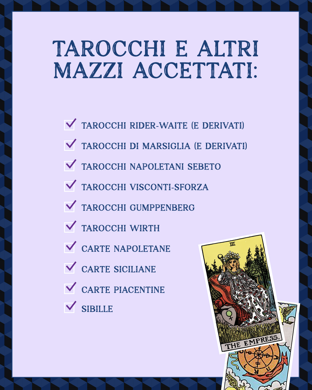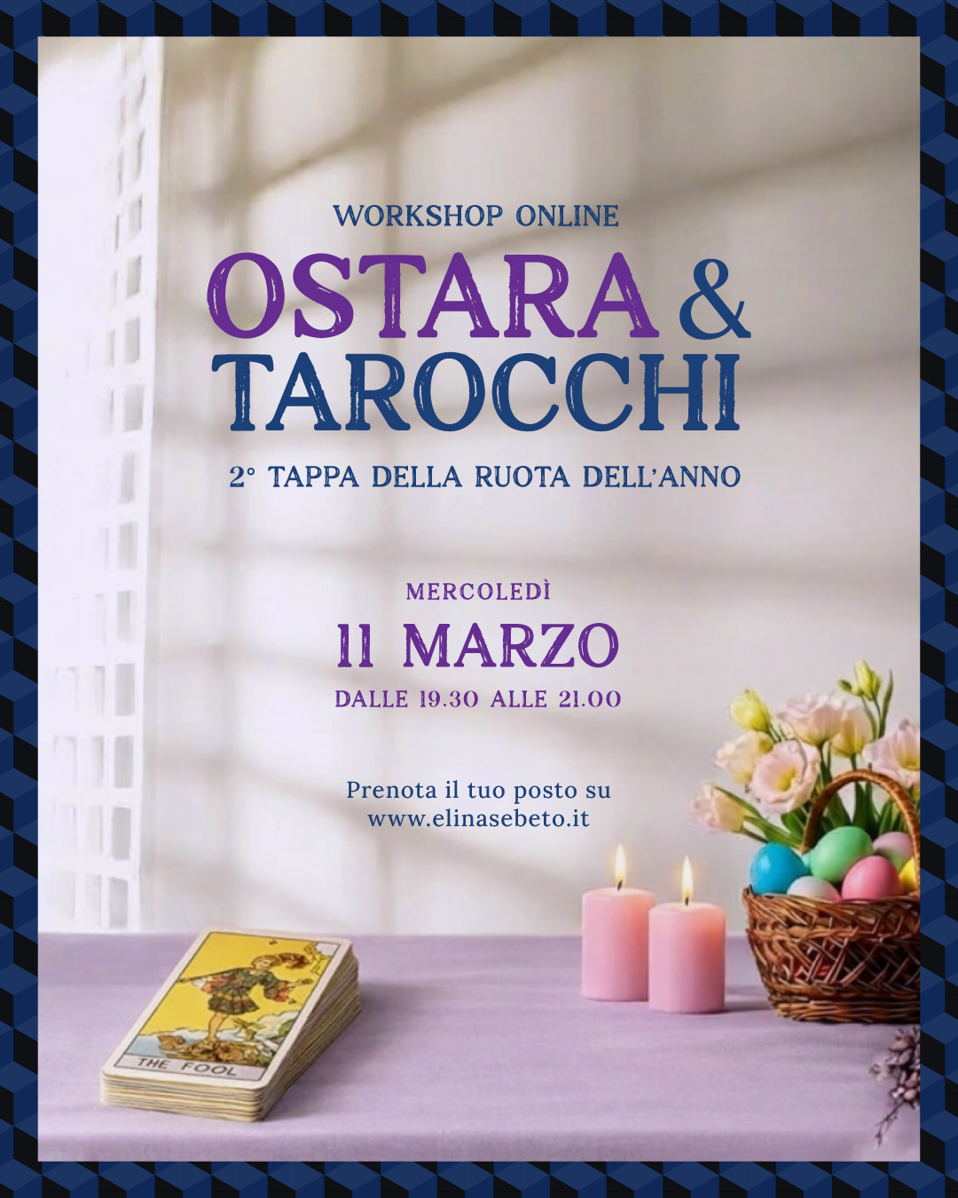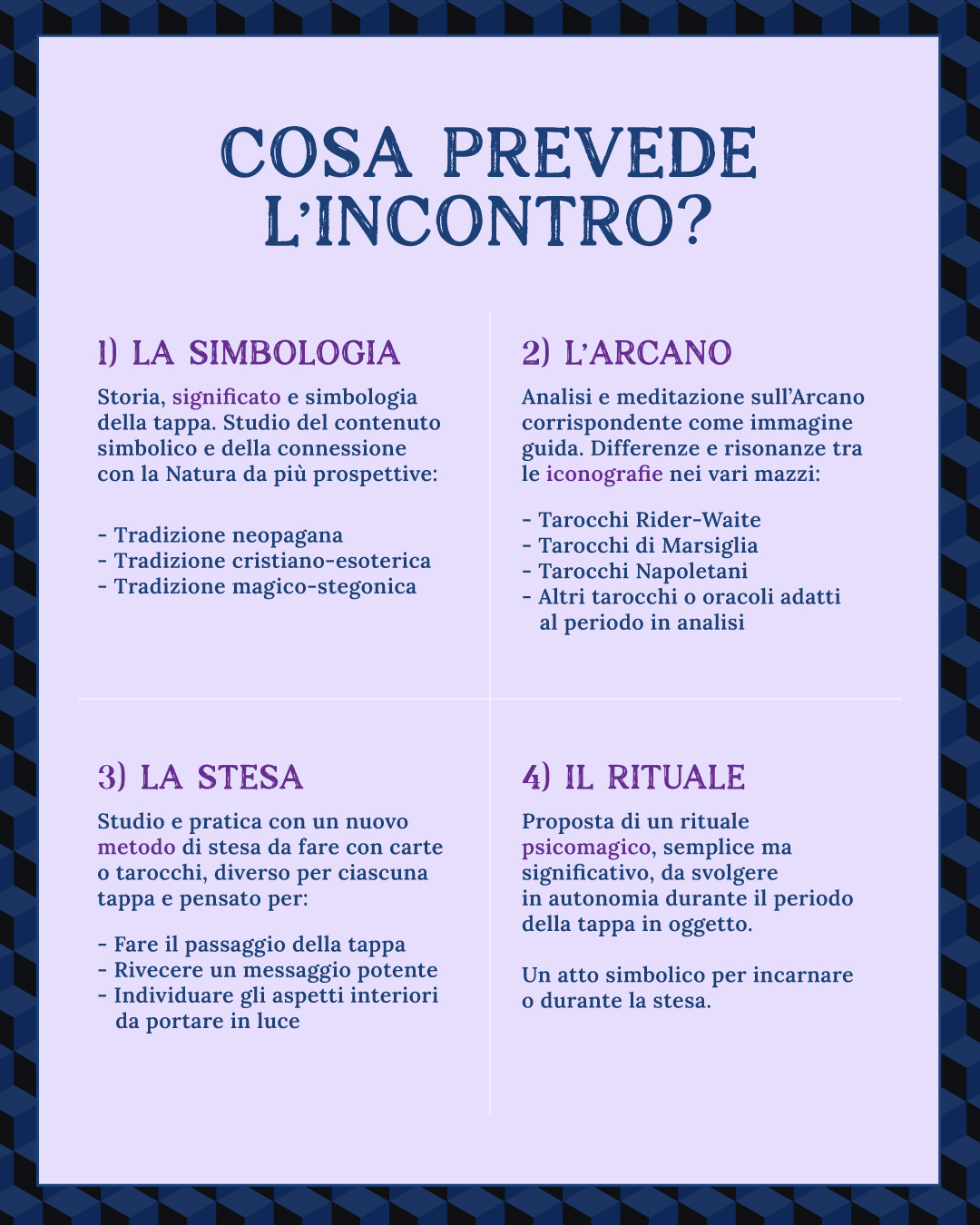 È un percorso in otto appuntamenti online, dedicato a chi desidera imparare a usare i Tarocchi (e le carte regionali) non solo come strumento di previsione, ma come linguaggio rituale e simbolico, capace di metterci in risonanza con i grandi passaggi dell’anno.