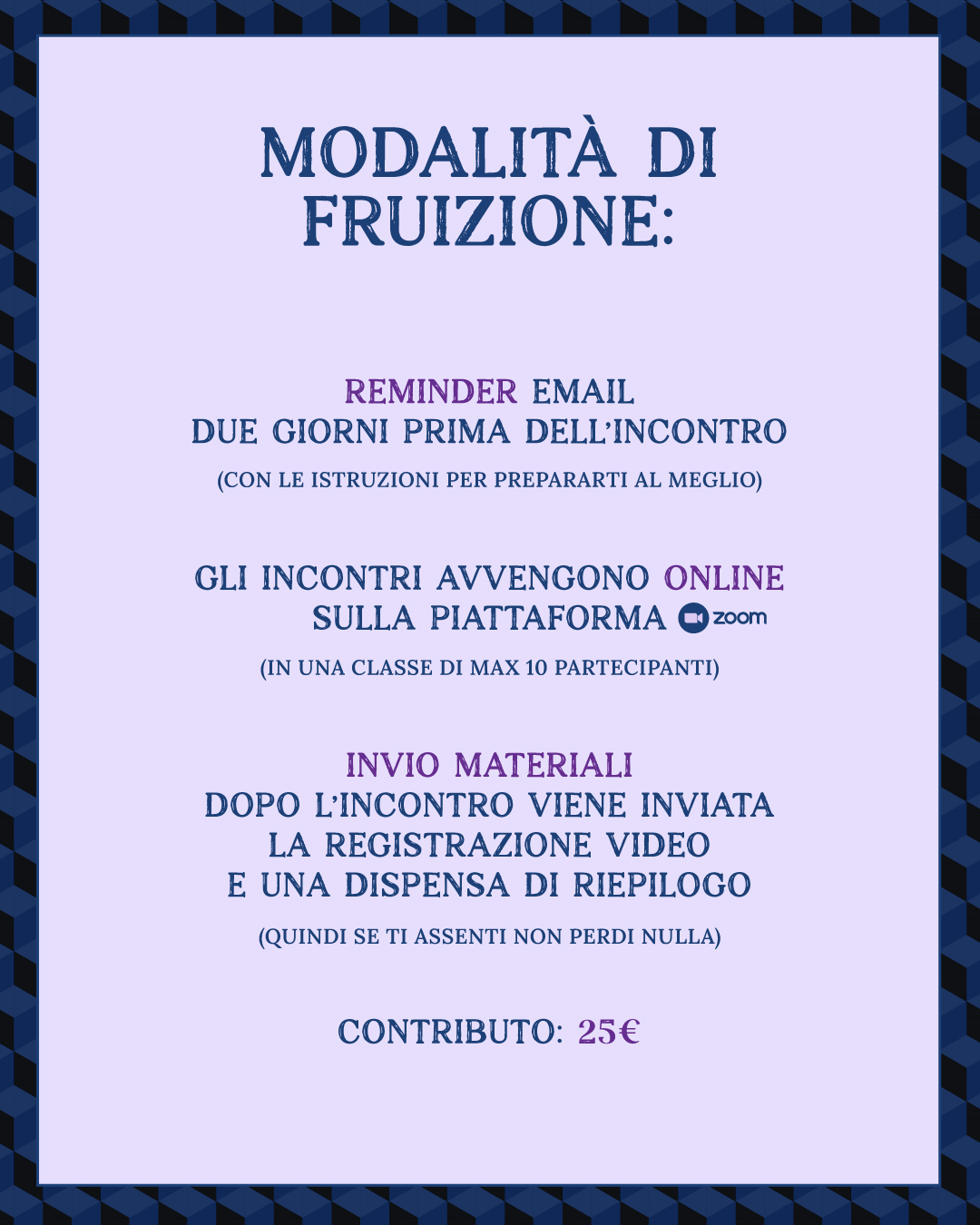 Dopo ogni incontro tutti gli iscritti ricevono la registrazione video e la dispensa.